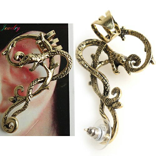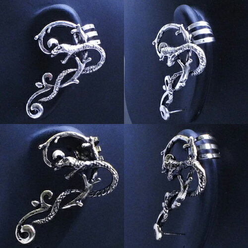 アンテークゴールド色と白銀色にメッキされたイバラと蛇をデザインしたイヤーラップピアス。